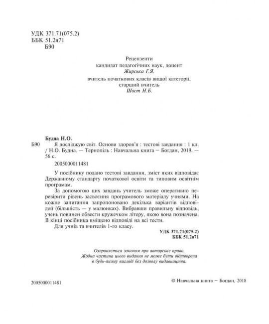 Тестові завдання Я досліджую світ Основи здоров’я 1 клас НУШ Авт: Будна Н.О. Вид-во: Богдан 19767