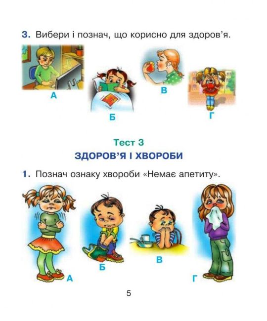 У посібнику подано тестові завдання, зміст яких відповідає Державному стандарту початкової освіти та типовим освітнім програмам. За допомогою цих завдань учитель зможе оперативно перевірити рівень засвоєння програмового матеріалу учнями. На кожне запитання запропоновано декілька варіантів відповідей більшість у малюнках. Вибравши правильну відповідь, учень повинен обвести кружечком літеру, якою вона позначена. В кінці посібника вміщено відповіді на всі тести.