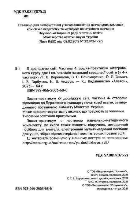Зошит практикум Я досліджую світ 1 клас Частина 4 НУШ створено відповідно до Державного стандарту початкової освіти, затвердженого постановою Кабінету Міністрів України від 21.02.2018 № 87. Може використовуватися за чинними Типовими освітніми програмами. Зошит є частиною навчально?методичного комплекту, до складу якого також входять: підручник, методичний посібник для вчителя, комплект наочних матеріалів, електронний мультимедійний посібник для учнів, збірка відеоматеріалів і комп’ютерних презентацій.