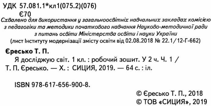 Робочий зошит Я досліджую світ 1 клас Частина 1 НУШ До підручника Гільберг Т.В. та ін. Авт: Єресько Т.П. Вид-во: Сиция 19782