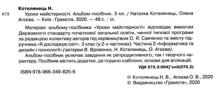 Уроки майстерності Альбом-посібник 3 клас НУШ Я досліджую світ Котелянець Н. Грамота. Матеріал альбому-посібника «Уроки майстерності» відповідає вимогам Державного стандарту початкової загальної освіти, чинної типової програми за редакцією колективу авторів під керівництвом О. Я. Савченко та змісту підручника «Я досліджую світ». 3 клас (у 2-х частинах): Частина 2 «Інформатика та дизайн і технології» (авторки В. Вдовенко, Н. Котелянець, О. Агєєва).
