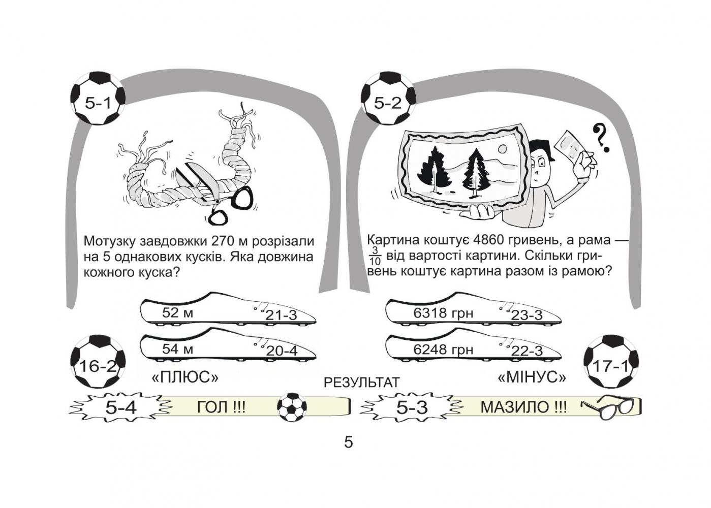 Книга-гра складається із 28-ми сторінок, на кожній з яких вміщено по 2 задачі, а під ними на стилізованих бутсах по два варіанти відповідей. Нижче – два уявні гравці «Плюс» і «Мінус» та футбольні м’ячі з номерами задач, а поряд – результати ходів («Гол!!!» та «Мазило!!!»). Сторінки пронумеровано від 4 до 31, а нумерація задач для зручності включає також номер відповідної сторінки: 4-1, 4-2, … 31-1, 31-2. Відповіді до задач та результати пронумеровані аналогічно: перше число – номер сторінки, а друге вказує на номер результату. Правила гри ? Лічилкою або жеребкуванням гравці встановлюють черговість виконання ходів. ? Домовляються, яку кількість ходів будуть виконувати (10-15-21) та скільки часу можна витрачати на розв’язування задачі (1-2-5 хв). ? Перший учасник відкриває книгу на довільній ігровій сторінці, а другий вказує йому, за якого футболіста грати («Плюс» або «Мінус»). Числа на м’ячі біля вказаного уявного футболіста означають номер сторінки та задачі, яку розв’язує гравець, а числа біля обраної відповіді – номер результату. Якщо гравець правильно розв’яже задачу, то «заб’є гол»; якщо ж він помилиться, то знайде напис «Мазило!!!». На цьому перший хід першого гравця завершено. ? З цієї сторінки у гру вступає другий учасник. Перший гравець вказує йому, за якого футболіста треба грати. ? Другий учасник розв’язує задачу, обирає відповідь і зачитує результат: «Гол!!!» або «Мазило!!!». ? Далі до гри долучається наступний учасник, починаючи зі сторінки, на якій завершив свій хід другий гравець. ? Перемагає той, хто заб’є більше голів за визначену кількість ходів. У випадку нічиєї, можна виконувати додаткові ходи до тих пір, поки хтось із гравців не помилиться. Якщо учасників гри багато, їх можна розбити на пари. Переможці пар утворюють нові пари. За такою кубковою системою можна визначити чемпіона. Нехай щастить!