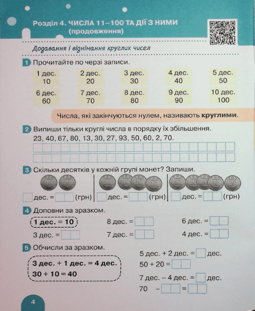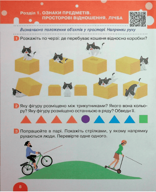 Наш посібник складається із трьох частин. На початку кожного розділу відскануй код і переглядай відео. Такти дізнаєшся, чого навчишся з тем розділу. Коли вивчатимеш числа першого десятка, ти будеш писати цифри, якими їх позначають. У цьому тобі допоможуть анімовані прописи, які можна переглянути, відсканувавши код праворуч.