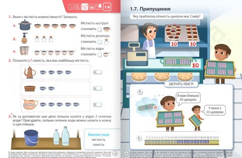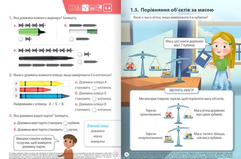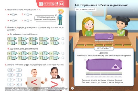 - Відповідність віковим особливостям. Візуальне наповнення посібника створене з урахуванням потреб дитини 6-7 років, тому теоретичний блок яскраво ілюстрований, а героями посібника є однолітки першокласників та першокласниць