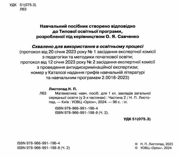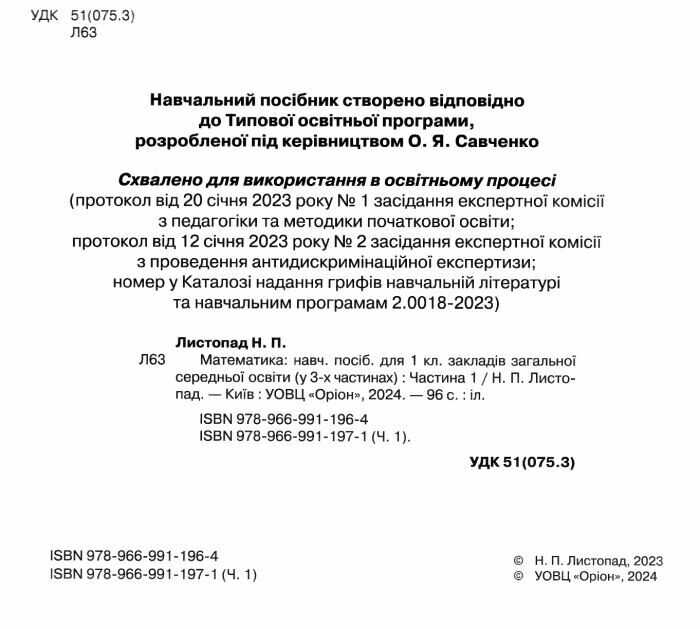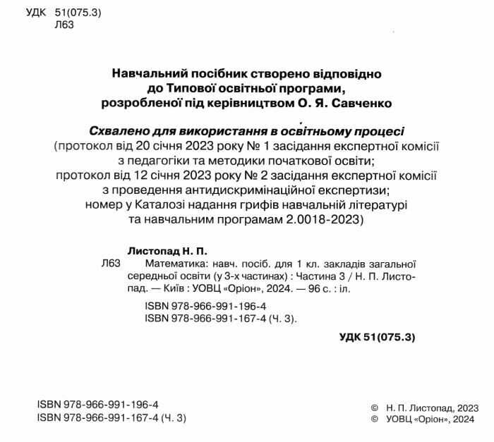 Навчальний посібник Математика 1 клас Комплект із 3-х частин НУШ Авт: Листопад Н.П. Вид-во: Оріон 90602