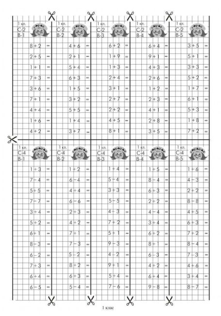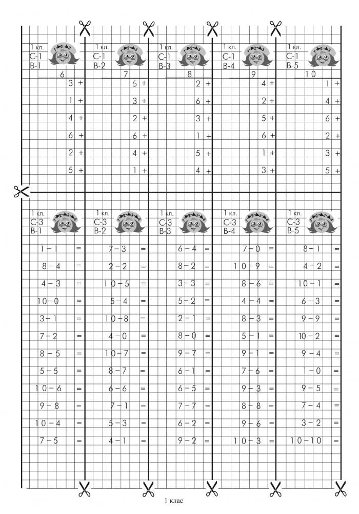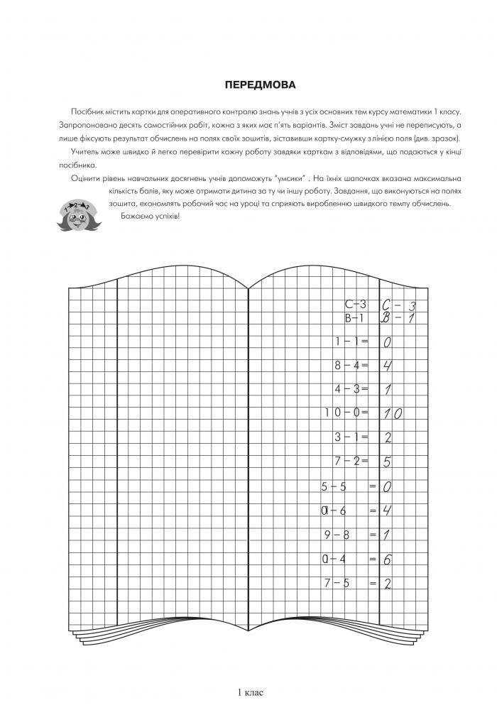 Набір карток для роботи на полях зошита призначений для самостійної та індивідуальної роботи з учнями. Завдання складені відповідно до Державного стандарту початкової освіти та типовим освітнім програмам й охоплюють усі основні теми курсу математики 1 класу. Картки відповідей допоможуть учителеві швидко, легко, зручно перевірити виконані завдання. Для вчителів початкових класів, першокласників та їх батьків.