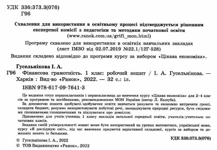 НУШ Фінансова грамотність Робочий зошит 1 клас Гусельнікова І. Ранок Нова українська школа. Використання робочого зошита "Фінансова грамотність" є невід'ємною частиною організації освітнього процессу з курсу "Я досліджую світ", а також використовується при вивченні варіативного курсу "Цікава економіка".