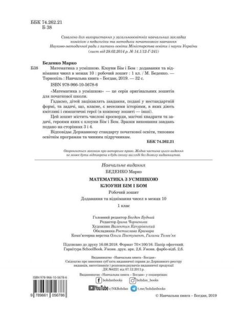 Робочий зошит Математика з усмішкою Клоуни Бім і Бом Додавання та віднімання чисел в межах 10 1 клас НУШ Авт: Беденко М.В. Вид-во: Богдан 20565