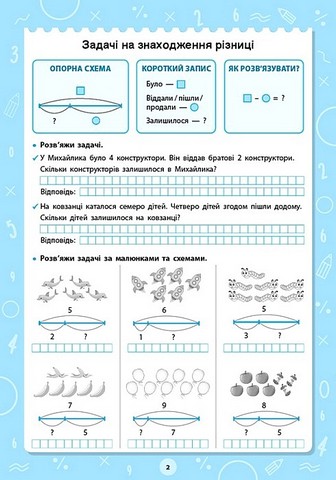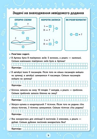 Цей тренажер допоможе дітям легко й ефективно опанувати розв’язування задач, а також сформувати навички швидкого й безпомилкового добору опорних схем, коротких записів і алгоритмів розв’язування. Автоматизація цих навичок значно прискорить і спростить будь-які обчислення та полегшить подальше вивчення математики. Для успішного відпрацювання цієї теми в тренажері подані різноманітні завдання, а також мотивувальні наліпки, які дитина може використати як для самооцінки, так і для самоперевірки. Зошит буде корисним як додатковий матеріал на уроках чи як помічник для самостійної роботи вдома.