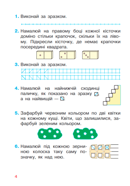 Вправи продумані так, щоби тренувати всі м’язи руки. Їх потрібно виконати не просто охайно, а дуже охайно. Увага дітей постійно розсіюється, і навіть на написанні рядка одиниць їм важко сконцентруватися. Тому на кожному уроці ми пропонуємо одне–два завдання, де писати треба не багато, але красиво.