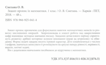 Зошит-пропис з математики 1 клас НУШ Авт: Сметана О.В. Вид-во: ПЕТ 20107
