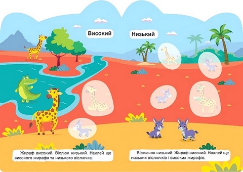 Серія "Кмітливі звірята" створена, щоб допомогти нашим найменшим читачам вивчати навколишній світ. За допомогою книги "Високий – низький. Один – багато." малюк вчитиметься розрізняти протилежні поняття, порівнюючи їх, знаходити ці відмінності на малюнках, а за допомогою наліпок закріплюватиме ці знання.