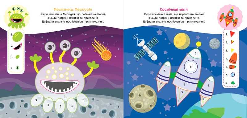 Окрім конструкторів з наліпок, у книжці на маленького розумника чекає 3D модель прибульця, вирізавши і склеївши яку, він отримає об’ємну паперову іграшку. Видання не лише урізноманітнить дитяче дозвілля, а й допоможе розвинути уяву й логіку, дрібну моторику й просторове мислення малюка, а також вивчити форми й кольори.