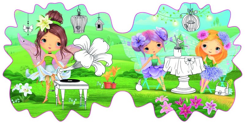 Запрошую тебе в чарiвний свiт, де я i мої подружки мешкаємо в маленьких будиночках-квiточках. Розфарбуй їх та прикрась за допомогою барвистих налiпок. Не забудь i про нас: добери яскравi кольори для нашого вбрання.