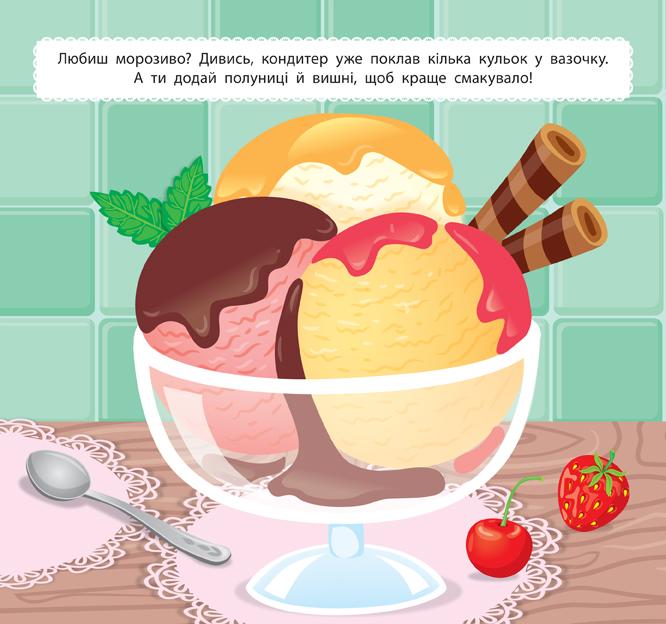 Видання містить великі тематичні ілюстрації солодощів і безліч наліпок для їхнього декорування.