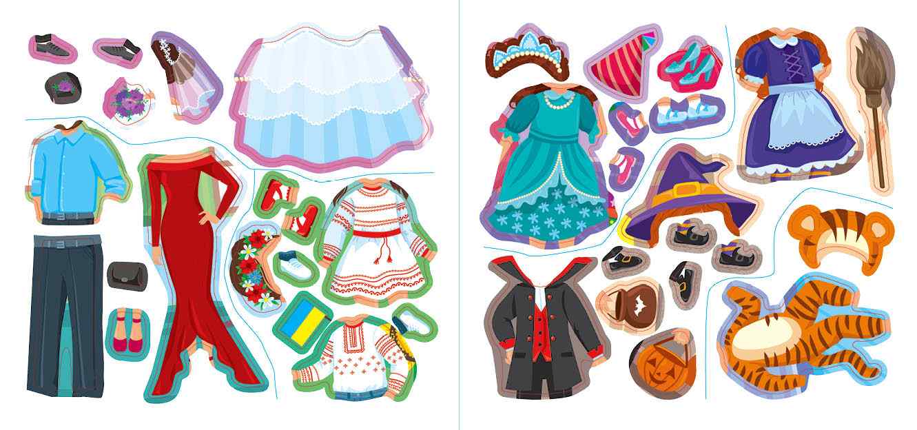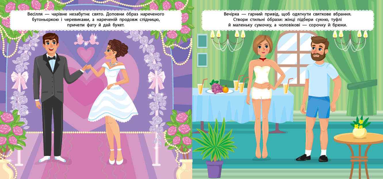 На сторінках книжки малюк підбере святковий одяг й аксесуари для весілля і дня народження, яскраві костюми для маскараду та Геловіну, неповторні костюми для танцювальних виступів, створить колоритні образи до Дня вишиванки й утілить у життя оригінальні й цікаві ідеї для піратської та гавайської вечірок.