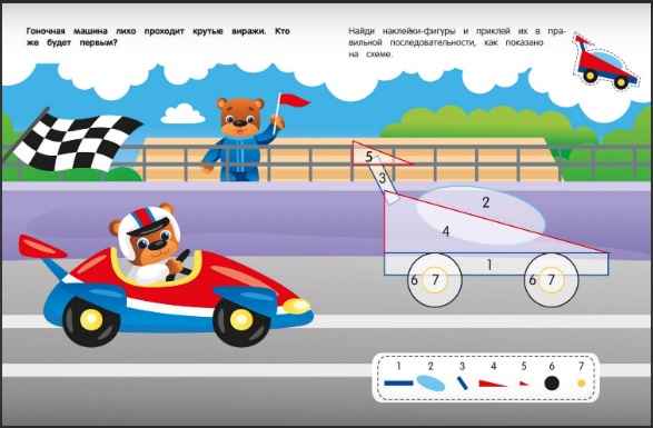 Машинки Мозаика из наклеек ПЕТ. На страничках этой книги можно собрать самые разные машины из ярких наклеек. Все наклейки строго геометрических форм, но стоит проявить фантазию и они превратятся в быстрые машинки!