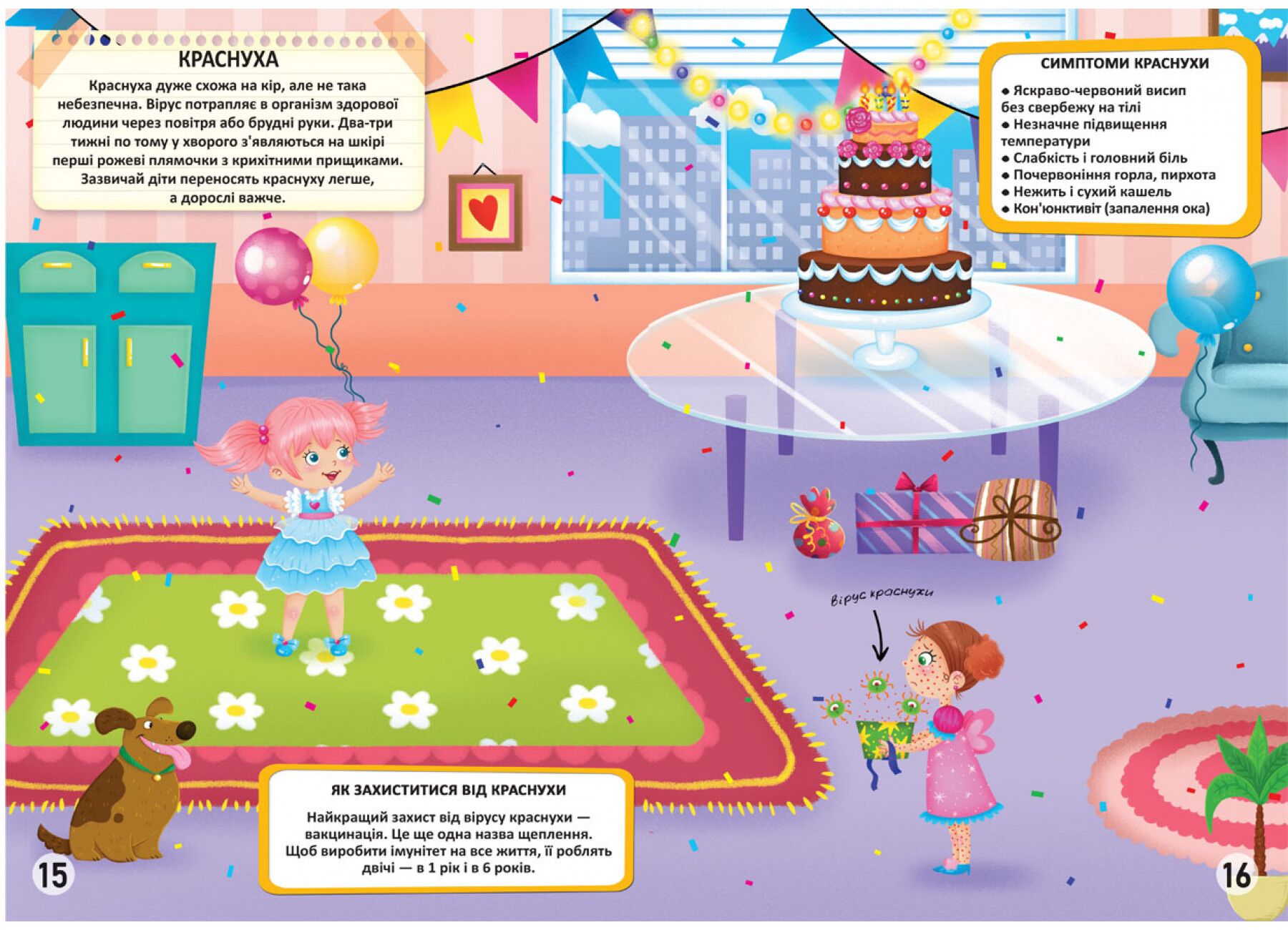 Хтось чхає, увесь укрився червоним висипом або не може підвестися з ліжка через високу температуру? У всьому винні віруси — маленькі підступні монстрики, які шкодять нашому здоров’ю. Хутчіш зазирни в книжку, щоб дізнатися, як з ними боротися! Фантазуй, вигадуючи власні історії про віруси. Тобі стануть у пригоді понад 300 меганаліпок! Використовуй як підказку зазначені поруч із ними номери сторінок.