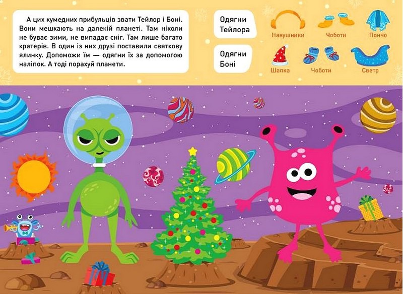 У книзі "У космосі" на малюка очікують яскраві наліпки у вигляді зимового одягу, аксесуарів. На сторінках книги дитина зустріне персонажів, до яких треба підібрати наліпки, тобто одягнути їх. Кожен розворот - то невеличка зимова пригода, у яку потрапили маленькі герої.