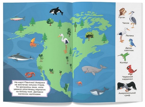 Хутчій зазирни в нашу книжку, щоб дізнатися, які птахи мешкають на кожному з континентів. Під час мандрівки материками на тебе чекатиме багато цікавих завдань. Виконати їх допоможуть 35 барвистих розвивальних наліпок. За підказку тобі правитимуть зазначені поруч із ними номери сторінок.