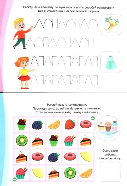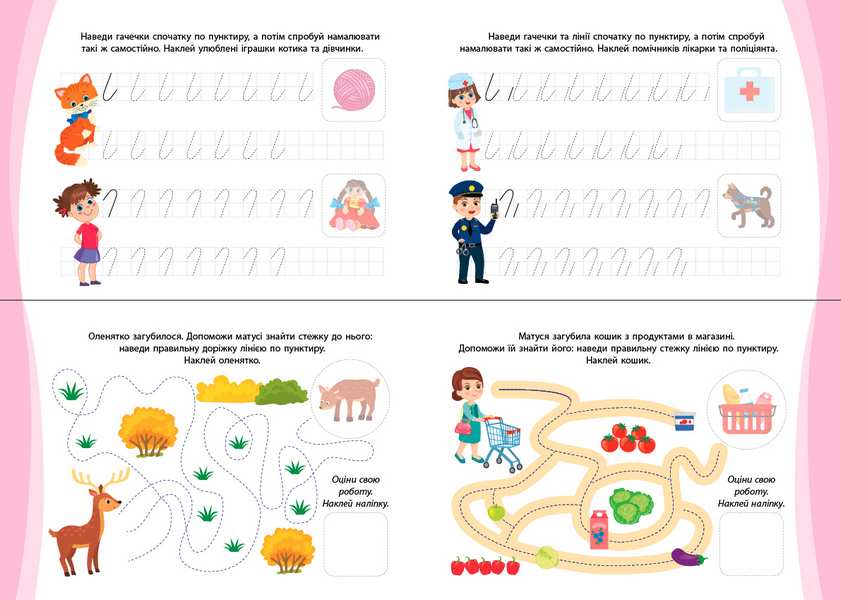 Під час виконання завдань дітям стануть у пригоді яскраві наліпки, а оцінити свою роботу можна спеціальними наліпками-оцінками. Працюючи з виданням, малюк розвине дрібну моторику пальців рук, просторове мислення, уміння орієнтуватися на аркуші паперу, а також підготує руку до письма.