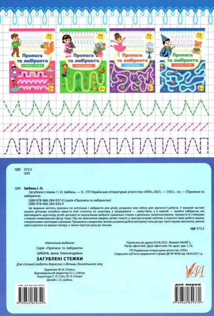 Прописи та лабіринти 66 наліпок Загублені стежки 6 Цибань І. УЛА. Це видання містить прописи по клітинках і лабіринти для дітей, розділені між собою для зручності роботи. У верхній частині зошита дітлахам потрібно навести лінії спочатку по пунктиру, а продовжити самостійно, а в нижній пройти лабіринти, які відповідають кругозору дітей: допомогти персонажам вибрати правильні стежки з декількох запропонованих, провести їх стежками з певних геометричних фігур тощо.