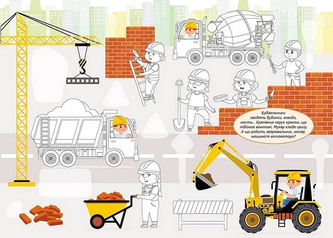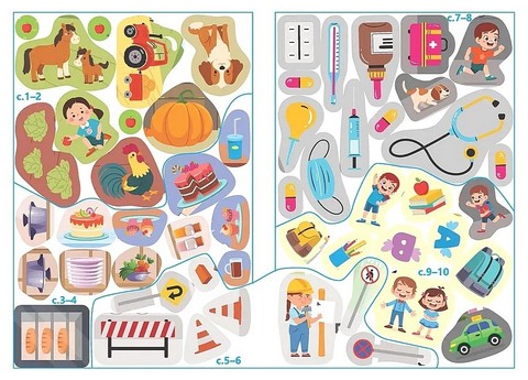 Книжка розповість про різні професії. Що робить фермер? Що готує кухар? Які споруди зводять будівельники? Хто навчає дітей у школі? А хто лікує? Запропонуйте дитині вигадати власні історії про людей різних професій, доповнити сторінки наліпками, розмалювати ілюстрації, що так завбачливо не домалював художник, закрити частину малюнка й пограти в «Що зникло?». Такі ігри не тільки захопливі, а й добре тренують дрібну моторику, розвивають фантазію, увагу та пам'ять дитини.