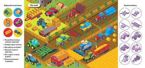 Завдання даної книги допоможуть вашій дитині розвинути мислення, кмітливість, увагу та дрібну моторику. Малюк відчує себе дослідником, бо шукатиме різні предмети, рослини, звірів, транспорт, відповідатиме на запитання та наклеюватиме яскраві наліпки.