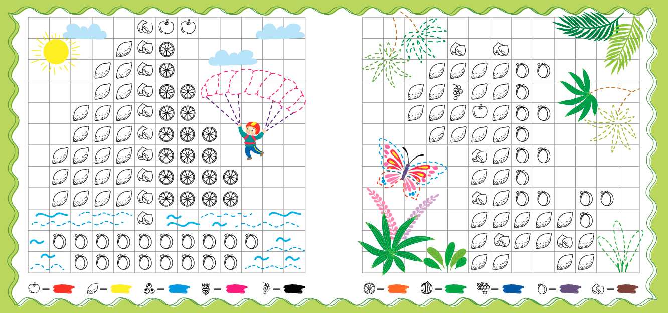 Для цього малечі потрібно зіставити зображення фруктів на схемі з кольорами наліпок, вибрати потрібні наліпки та наклеїти їх у відповідні місця. Зібравши мозаїки, дитина креативно доповнить картинки, навівши по пунктиру та розфарбувавши окремі елементи.