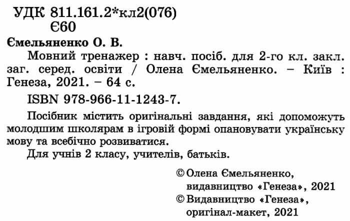 Мовний тренажер 2 клас НУШ Авт: Ємельяненко О.В. Вид-во: Генеза 63275