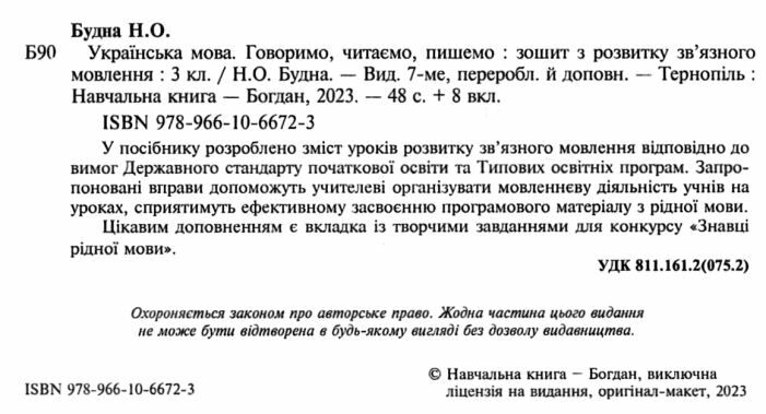Українська мова 3 клас Говоримо читаємо пишемо Зошит з розвитку зв’язного мовлення НУШ Будна Н. Богдан. У посібнику розроблено зміст урокiв розвитку зв’язного мовлення вiдповiдно до вимог Державного стандарту початкової освіти та Типових освітніх програм.