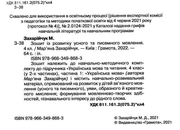 Зошит з розвитку усного та писемного мовлення 4 клас НУШ Захарійчук М. Грамота Нова українська школа