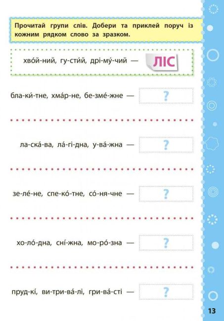 Видання охоплює матеріал 1 класу з предмета «Українська мова» і відповідає вимогам освітніх програм мовно-літературної галузі Нової української школи. Ігрова форма завдань, 100 наліпок і яскраві ілюстрації допоможуть легко сформувати ключові компетентності дитини та закріпити набуті в школі знання.