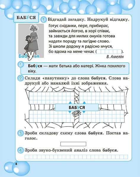 Містить вправи, спрямовані на вдосконалення орфографічних навичок, розвиток творчої уяви, логічного та креативного мислення складання «асоціативного куща» до словникового слова, тлумачення слова, відгадування загадки, підбір синонімів, складання речення тощо.