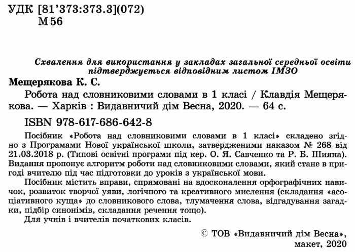 Робота з словниковими словами в 1 класі НУШ Мещерякова К. Весна. Посібник складено згідно з Програмами Нової української школи