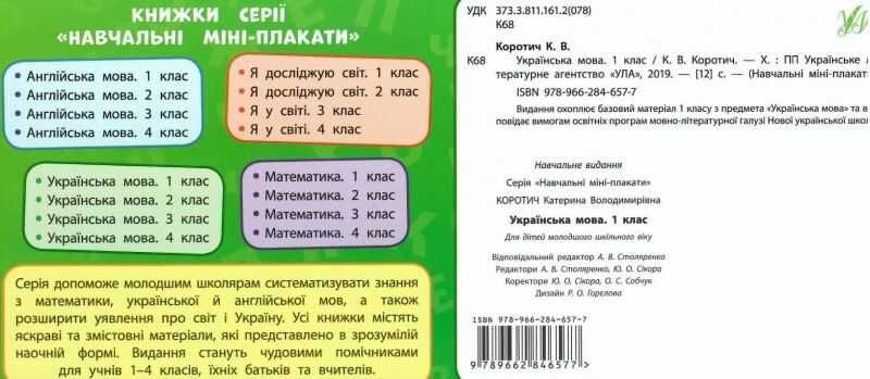НУШ Українська мова. 1 клас Навчальні міні-плакати УЛА стане для вас цікавим помічником у навчанні для учнів 1–4 класів, їхніх батьків та вчителів початкової школи. Видання охоплює базовий матеріал 1 класу з предмету Українська мова та відповідає вимогам освітніх програм мовно-літературної галузі Нової української школи.