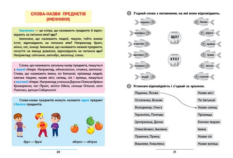 На сторінках цього посібника розміщено завдання, виконуючи які дитина закріпить знання про голосні і приголосні звуки, апостроф, знак м’якшення, наголос, правила переносу слів, лексичне значення слова, слова-назви предметів, ознак, дій і кількості, а також про службові слова, речення і текст. Посібник побудовано з урахуванням дитиноцентризму, доступності й практичної спрямованості змісту. Видання відповідає Типовим освітнім програмам НУШ і стане в пригоді як додатковий тренажер на уроках, а також буде корисним для занять удома самостійно та з батьками. Книжка містить розмаїті завдання, що розвиватимуть уяву, мислення і дрібну моторику, стимулюватимуть зацікавленість дитини в навчанні.