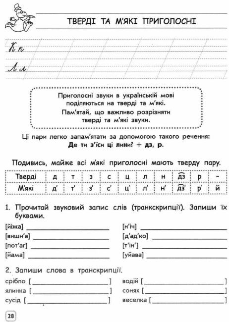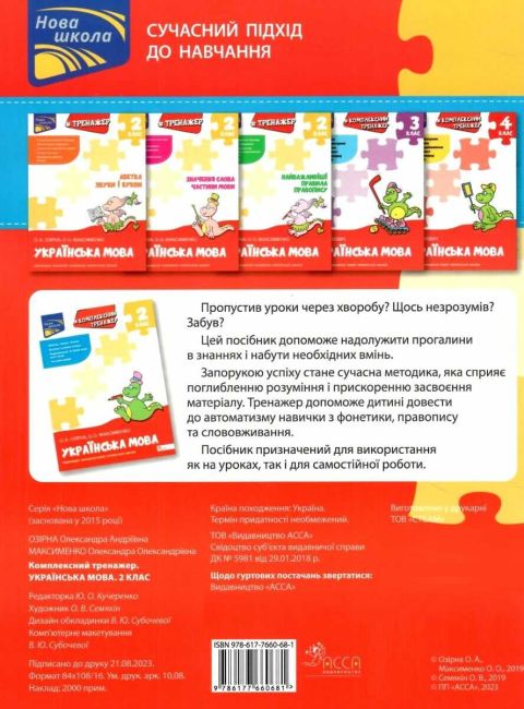 Тренажер. Комплексний Українська мова 2 клас АССА. Цей мовний тренажер ознайомить дитину з відповідністю звуків та букв в українській мові, навчить правил вживання апострофа та написання подовжених м’яких приголосних, допоможе запам’ятати правила написання великої та малої літер, правильного переносу слів.