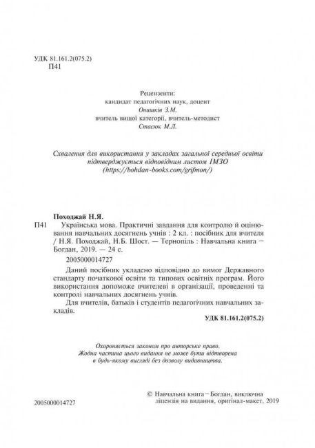 Практичні завдання для контролю й оцінювання навчальних досягнень учнів Українська мова 2 клас НУШ Авт: Н.Я. Походжай Н.Б. Шост Вид-во: Богдан 97395
