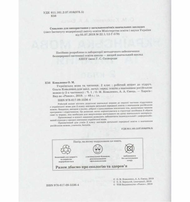 Українська мова та читання 2 клас 1 частина Зошит до підручника Коваленко О. НУШ. Робочий зошит містить додаткові навчальні вправи до першої частини підручника з української мови для 2 класу закладів загальної середньої освіти з навчанням російською мовою. Завдання, вміщені в ньому, дібрані з урахуванням лексичних тем, визначених чинною програмою і підручником. Це дозволяє легко зорієнтуватися в структурі посібника й обрати саме ту вправу, яка необхідна для закріплення виучуваного на уроці навчального матеріалу.