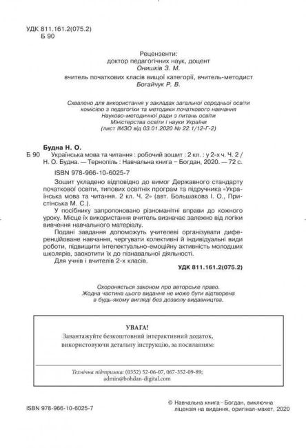 Робочий зошит Українська мова та читання 2 клас Частина 2 НУШ До підручника Большакової І.О. Пристінської М.С. Авт: Будна Н.О. Вид-во: Богдан 97399