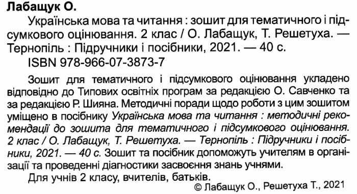 Методичні поради щодо роботи з цим зошитом уміщено в посібнику Українська мова та читання : методичні рекомендації до зошита для тематичного і підсумкового оцінювання. 2 клас / О. Лабащук, Т. Решетуха. Тернопіль Підручники і посібники, 2021. 40 с.