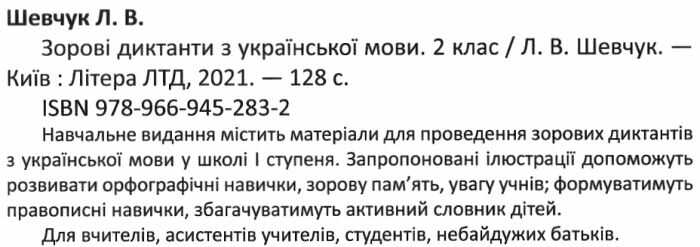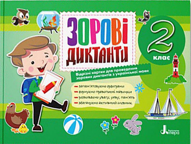 Зорові диктанти з української мови 2 клас Шевчук Л. Літера. Навчальне видання містить матеріали для проведення зорових диктантів з української мови у школі І ступеня. Запропоновані ілюстрації допоможуть розвивати орфографічні навички, зорову пам’ять, увагу учнів; формуватимуть правописні навички, збагачуватимуть активний словник дітей.