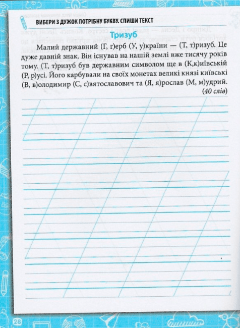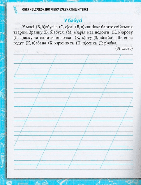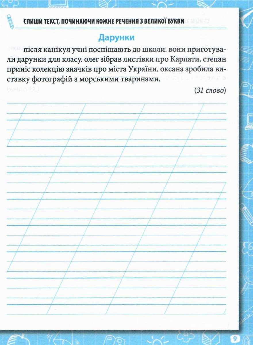 Посібник містить дрібні тексти з поступовим ускладненням. Матеріали зошита сприятимуть організації ефективної роботи зі списування як навчального прийому, що спрямований на розвиток в учнів другого класу зорової пам’яті, здатності до імітації, орфографічної пильності, техніки письма, вміння порівнювати написане зі зразком.