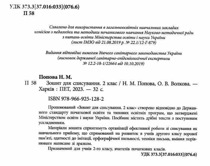 Зошит для списування 2 клас НУШ Авт: Попова Н.М. Волкова О.В. Вид-во: ПЕТ 22880