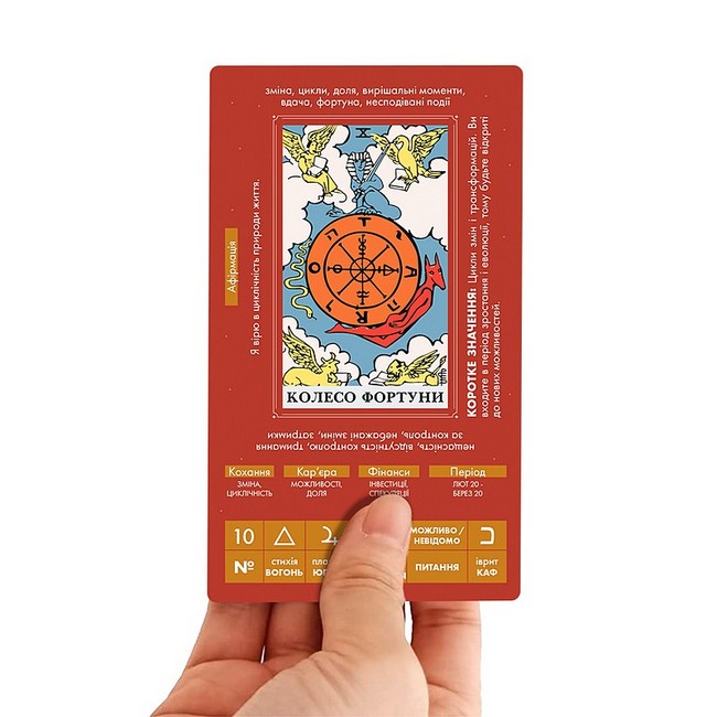 На картах також вказані афірмації, пряме та перевернуте значення карти та її значення у різних сферах життя.