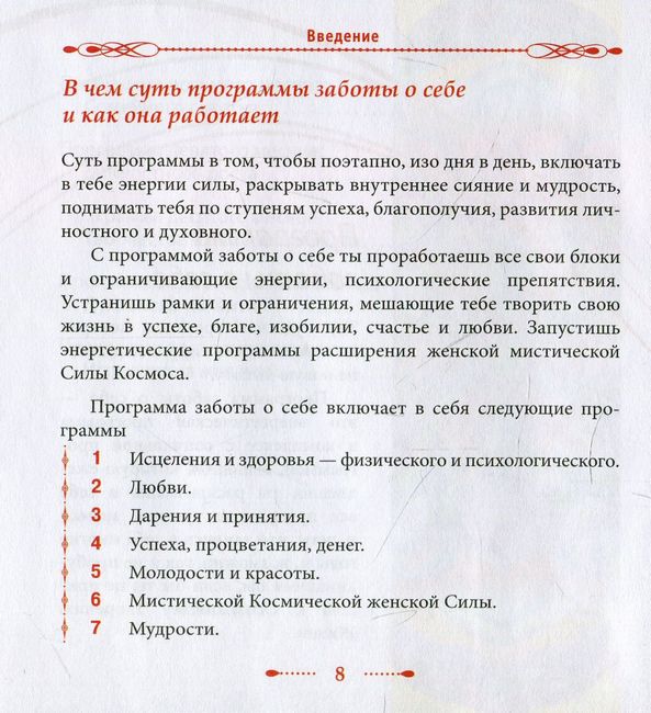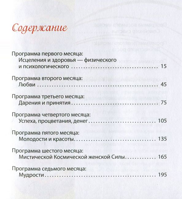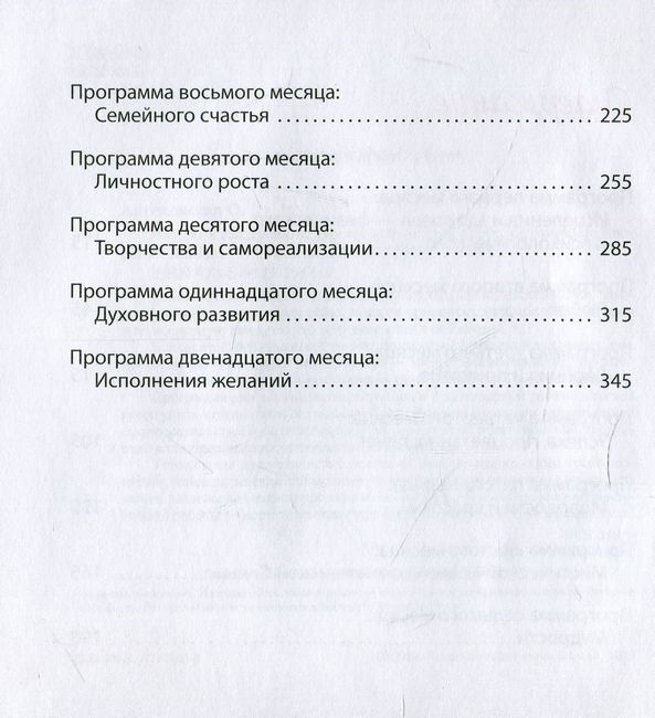 Программа рассчитана на год активной и плодотворной работы, причем приступить можно с любого месяца! Каждый месяц посвящен определенной сфере жизни: семейное счастье, здоровье, финансовое благополучие, творчество и самореализация, исполнение желаний и др.